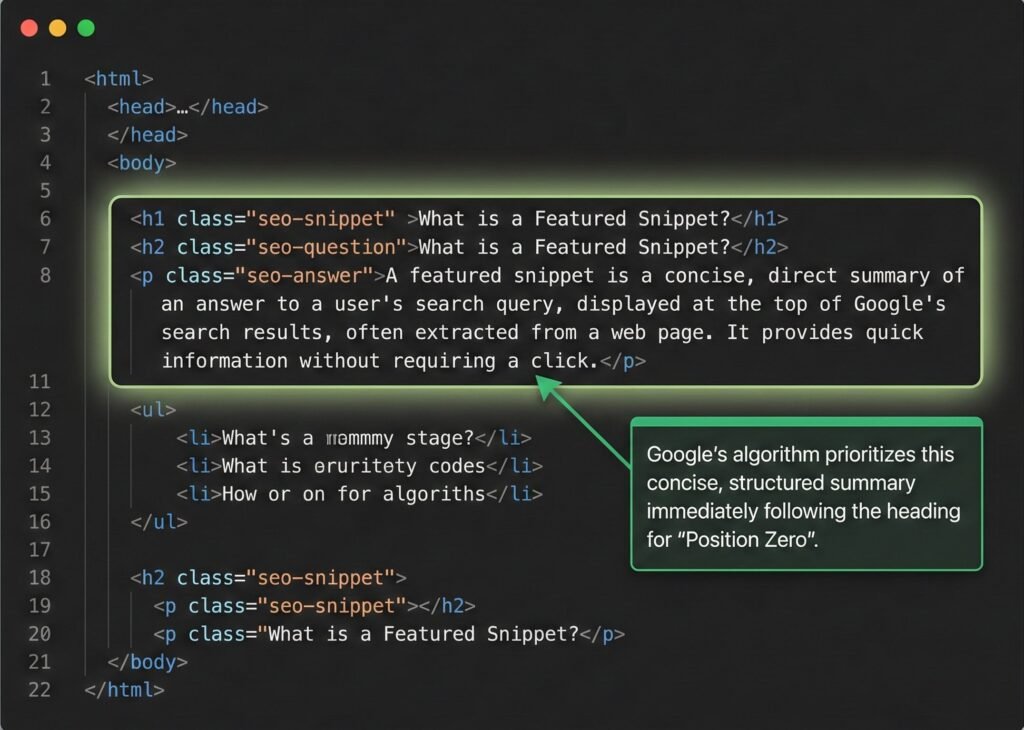 - Capturing Position Zero: To win featured snippets, use a specific formatting hack: Immediately following an H2 or H3 heading that contains your target keyword, provide a 40-60 word concise summary. Google’s algorithm prioritizes this structured information for the coveted “Position Zero” spot.