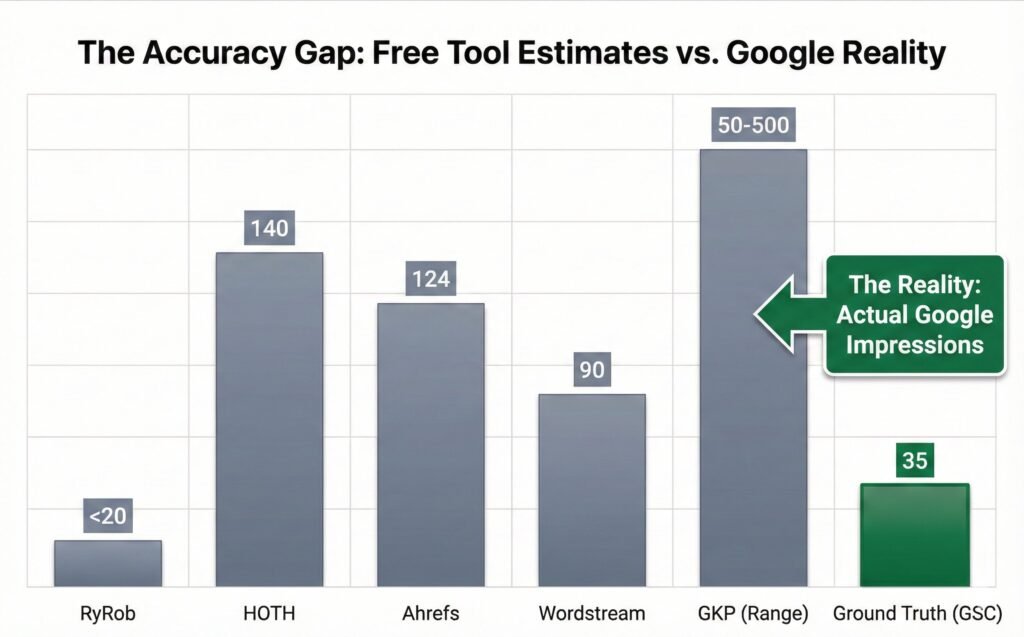 Many free keyword research toolsprovide search volume data that varies wildly, leading to a massive “Accuracy Gap.” To prove this, let’s look at a case study for the keyword “Rank Math Tutorial.” Here is how the free platforms stacked up against the “ground truth” of Google Search Console (GSC):